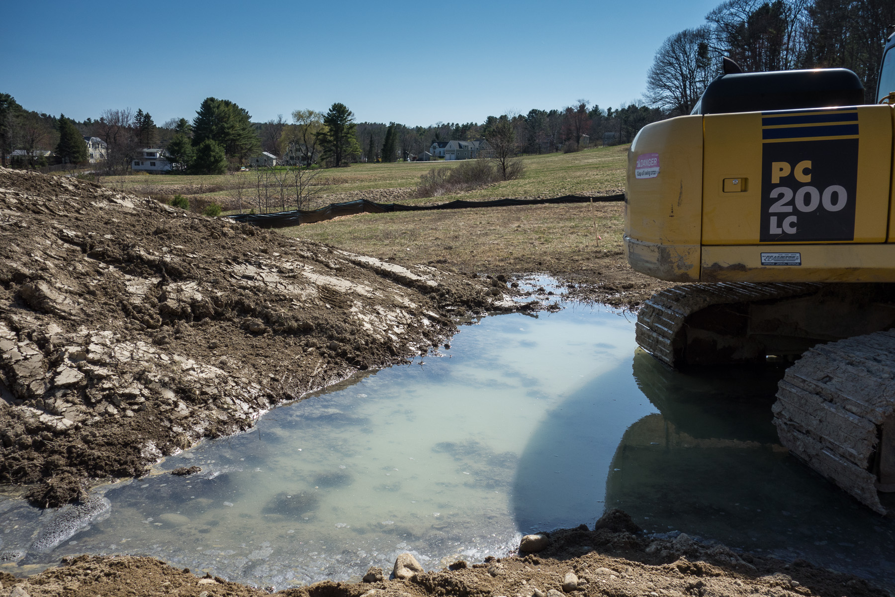 When we went to the site after the weekend, there was water everywhere. Running down the hill, puddled around the equipment, you name it.