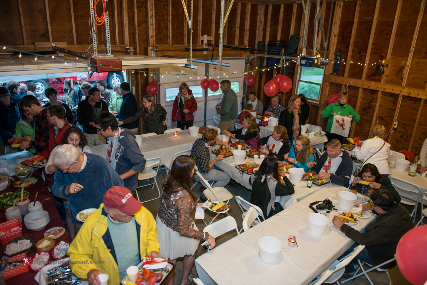 * If you’ve invited 80 people to an outside lobster feed to celebrate a college graduation and it turns out to be 47 degrees, driving rain and otherwise crappy, everyone will fit nicely in the garage. You know it’s a special place when someone from Mumbai has dinner wedged between a chainsaw and a road bike and tells you “That was the best lobster ever!” :