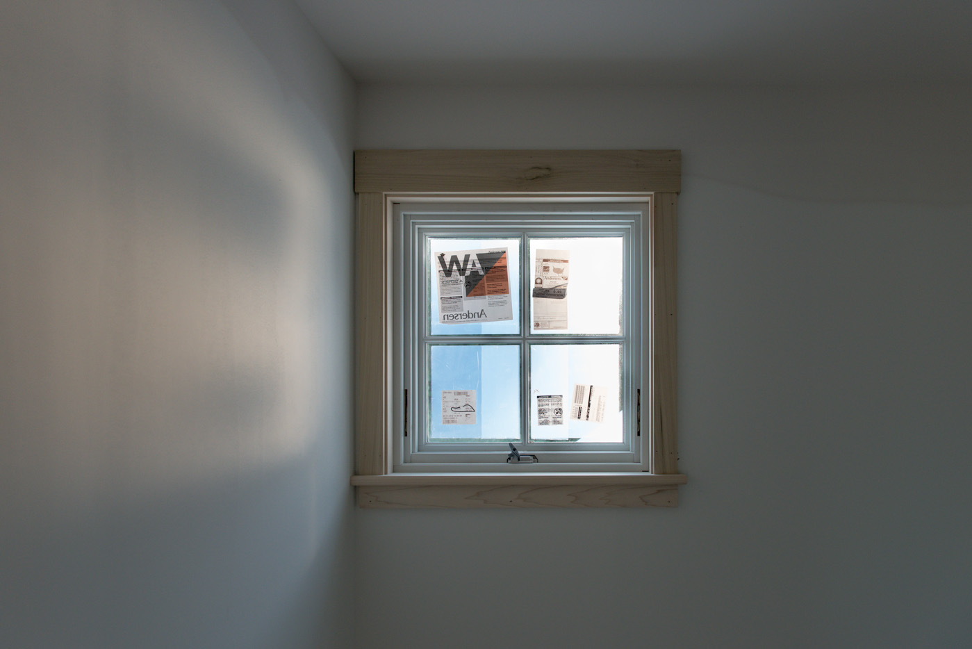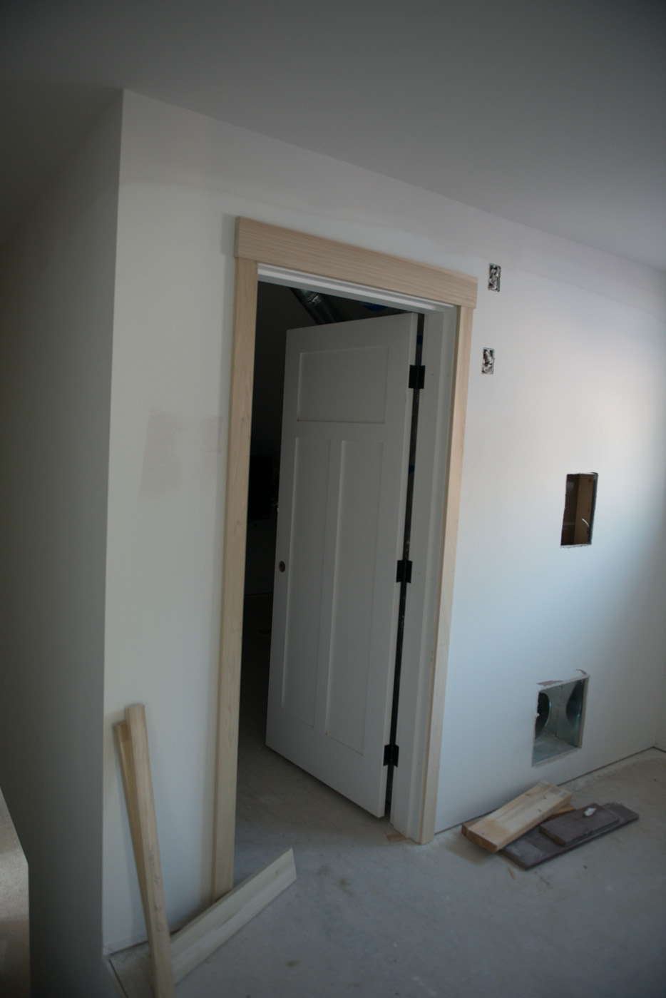 The sharp-eyed among you might also notice something a little different in the door and window casing — they’re just a bit narrower than you’d typically see in a new home. Given the high ratio of windows to walls , Rob thought that standard width casing would be a bit “overwhelming.” Definitely different, but we’re liking it.