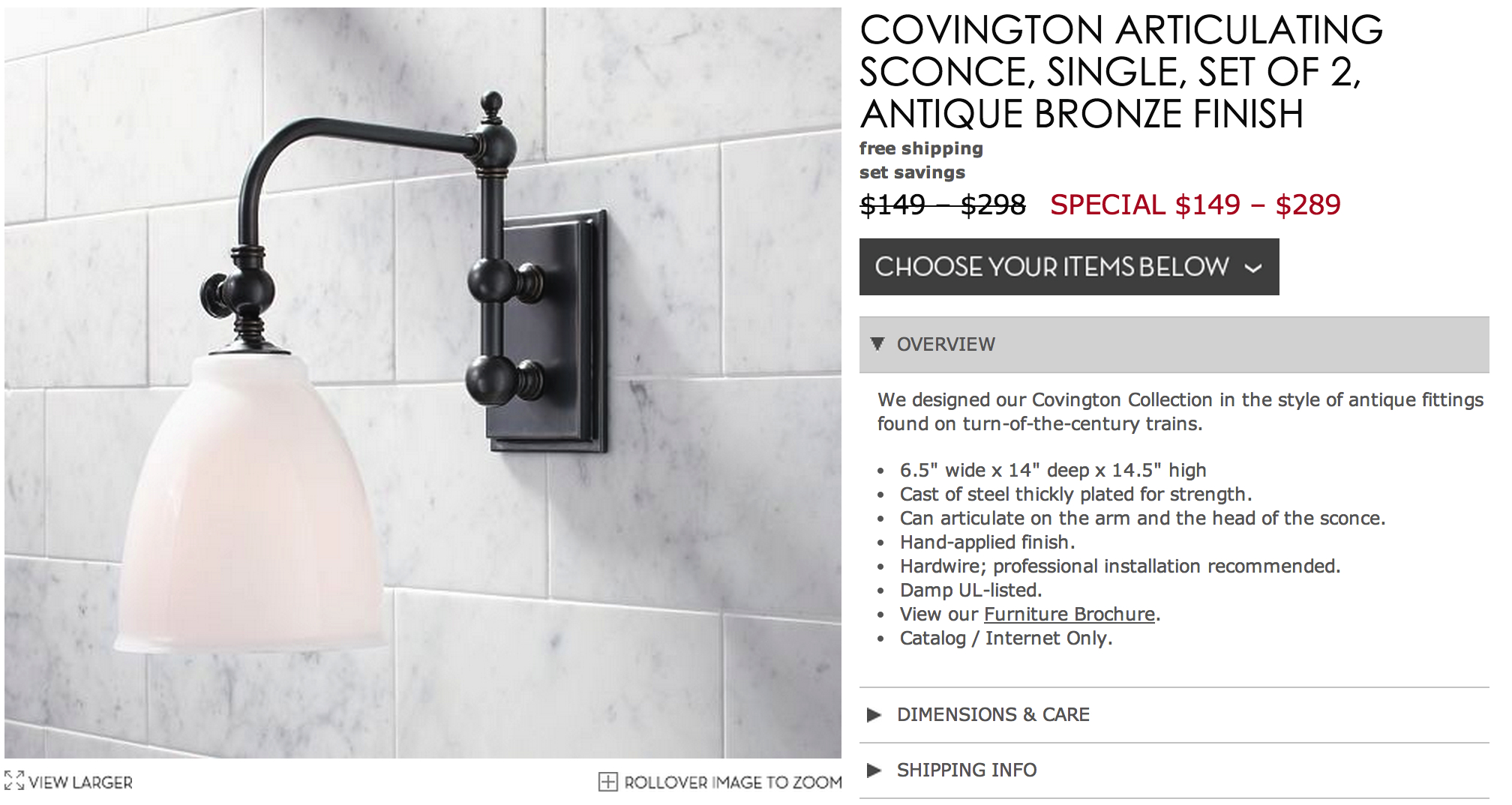 On September 29th, we ordered this excellent looking light along with a couple of mirrors from Pottery Barn :